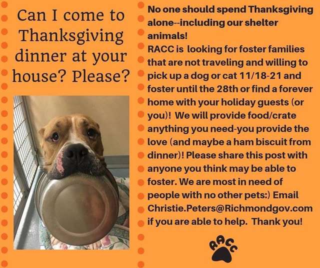 2018年11月18日美國里士滿一間浪浪庇護所(Richmond Animal Care and Control ,RACC)的主任彼得斯四年前正準備迎接感恩節假期時,她想著人們和朋友、家人一起度過感恩節,而在浪浪庇護所裡的毛小孩卻只是平常的度過一天,於是他想「如果人們可以邀請毛小孩一起度過感恩節晚餐,會不會很有趣?」