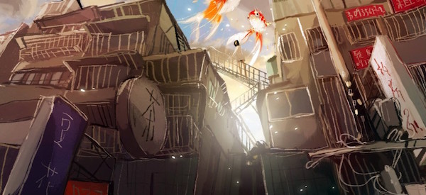 ▼在她的觀察下,她覺得台北有許多人都生活在牢籠裡,日復一日地搭乘交通工具去上班。除了這種苦悶的情緒外,她也會為這裡添入一道曙光,例如在天空遨遊的金魚,有著無拘無束的想像力。
