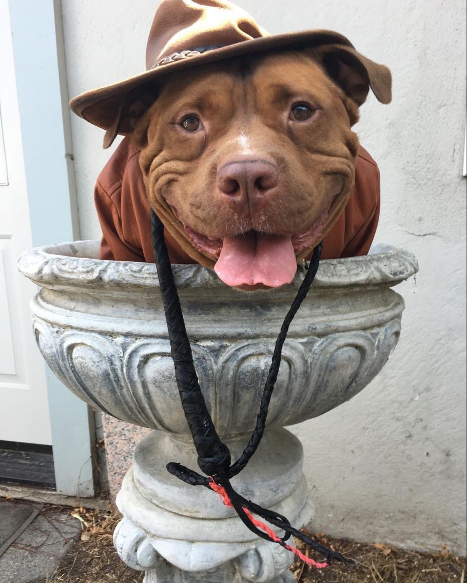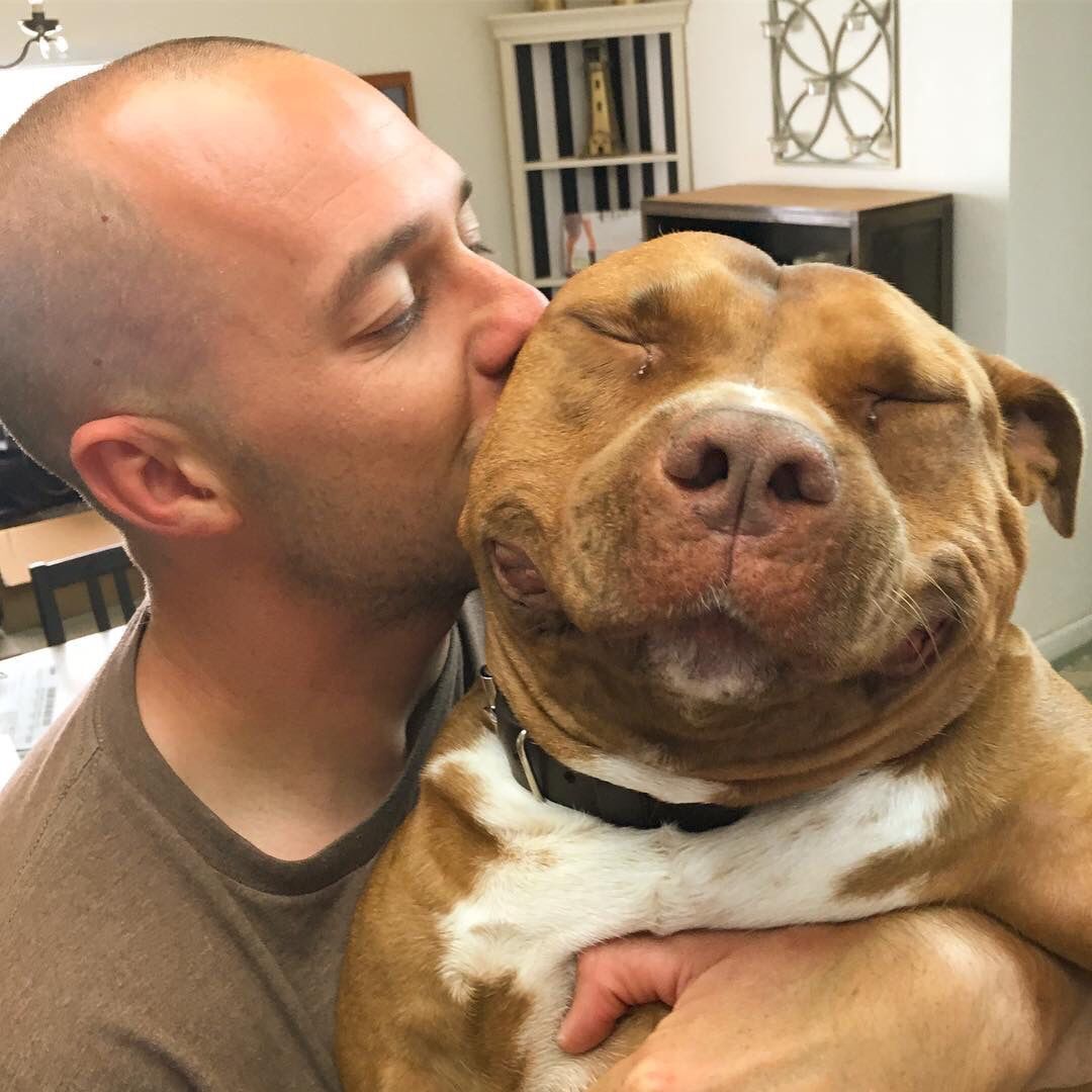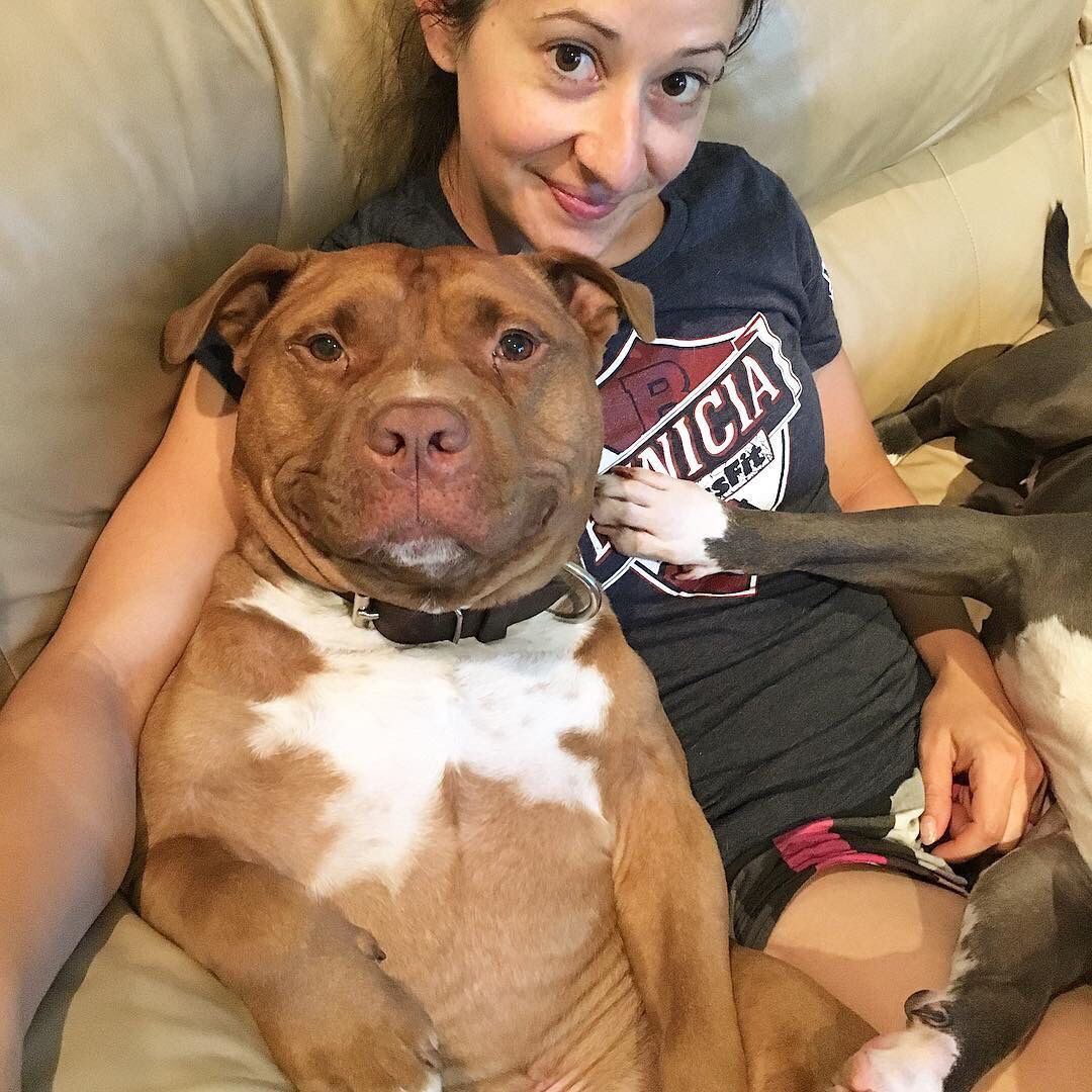▼經過收容所的治療,肉丸完全康復,就被麗薩帶到家中。現在牠和家中另外兩隻鬥牛犬相處的非常融洽,一家人其樂融融。