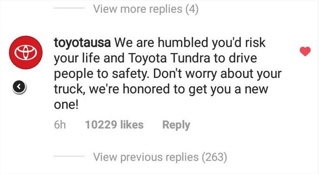 ▼美國豐田的官方帳號也迅速做出了回應,表示為了表揚他的英勇事跡,決定送艾林一輛全新的Tundra作為致意!