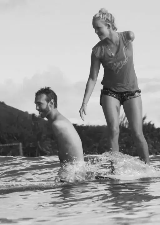 ▼尼克一出生就沒有四肢,直到現在,他的身上也沒有發生奇蹟。但他欣然面對這樣的命運,並說:「我喜歡各種新挑戰,例如刷牙,我把牙刷放在架子上,然後靠移動嘴巴來刷。有時確實很困難,但我最終解決了它。」