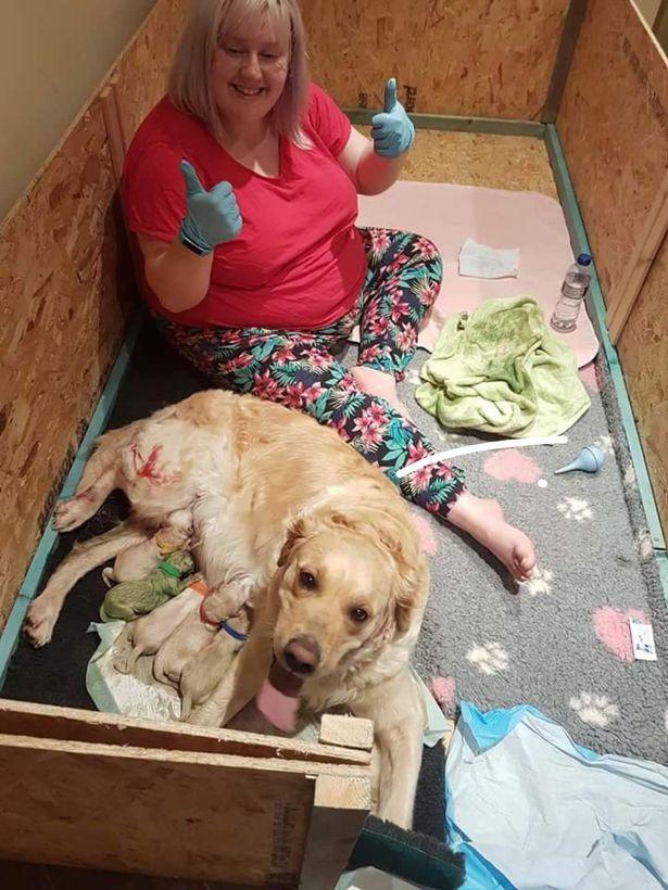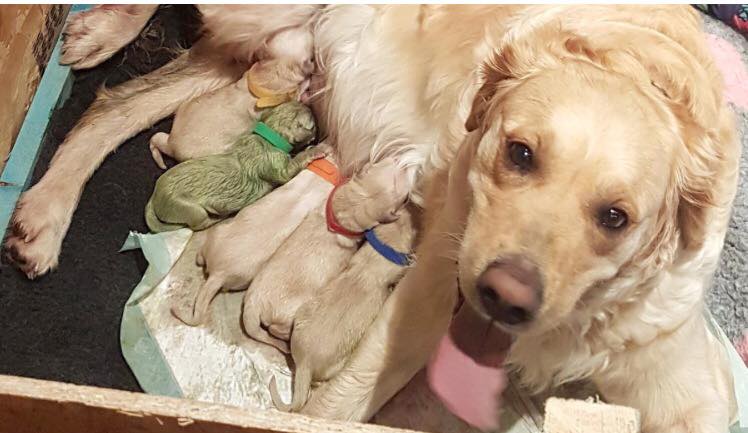 2018年12月04日前幾天,英國一隻黃金獵犬順利生下了9個寶寶。主人超開心,但仔細查看時才發現,其中一隻小狗的顏色不太對,牠是綠色的!
