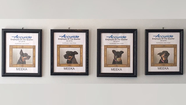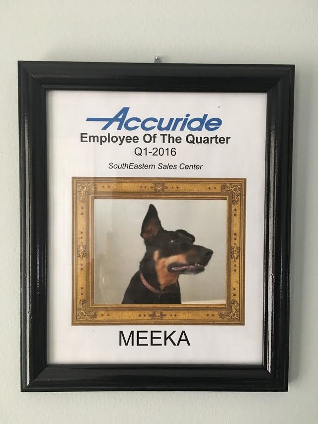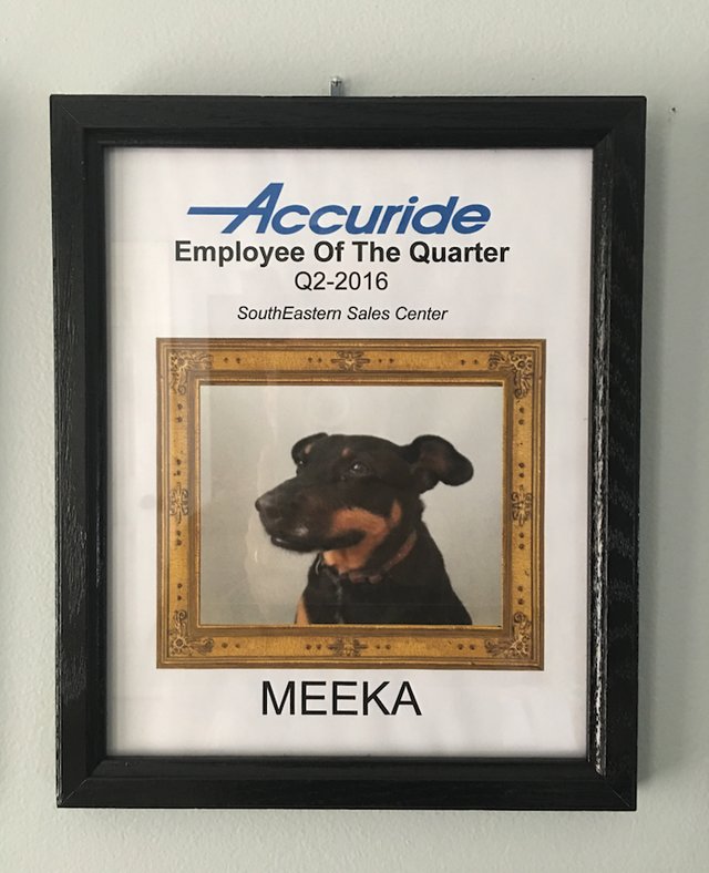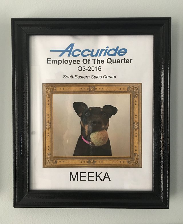 2018年12月04日你見過贏得「最佳員工獎」的狗狗嗎?Meeka就是這樣一隻超級乖巧、超級認真的狗狗。牠是「Accuride International Inc.」公司的員工,公司的老闆就是牠的爸爸Michael Reeg。