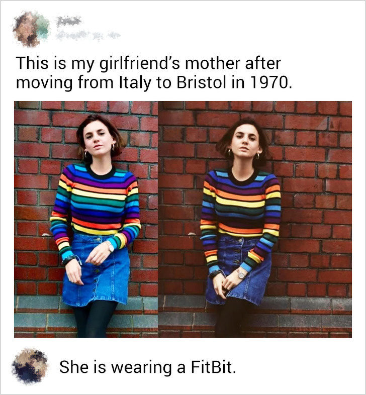 ▼「這是我女友的媽媽,她1970年代從義大利搬到布里斯托時拍的。」「但她戴著Fitbit運動手錶啊。」