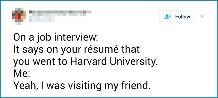 ▼「面試官:你的履歷表上寫著,曾去過哈佛大學。我:是的,我去看朋友。」