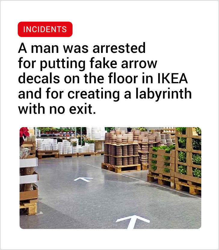 ▼「一名男子在IKEA的地上放了錯誤的箭頭,想創造走不出來的迷宮,最後被捕了。」