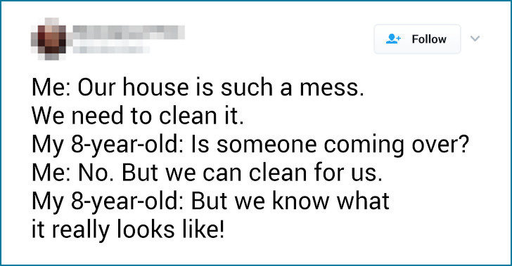 ▼「我:我們家太亂了,得整理一下。8歲兒子:有客人要來嗎?我:沒有,但我們可以為了自己打掃啊。8歲兒子:但我們已經知道它真正的模樣了啊!」