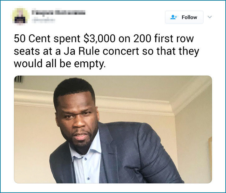 ▼「50 Cent花3000美元(約9.2萬新台幣)買傑・魯演唱會的200個第一排座位,好讓第一排是空的。」