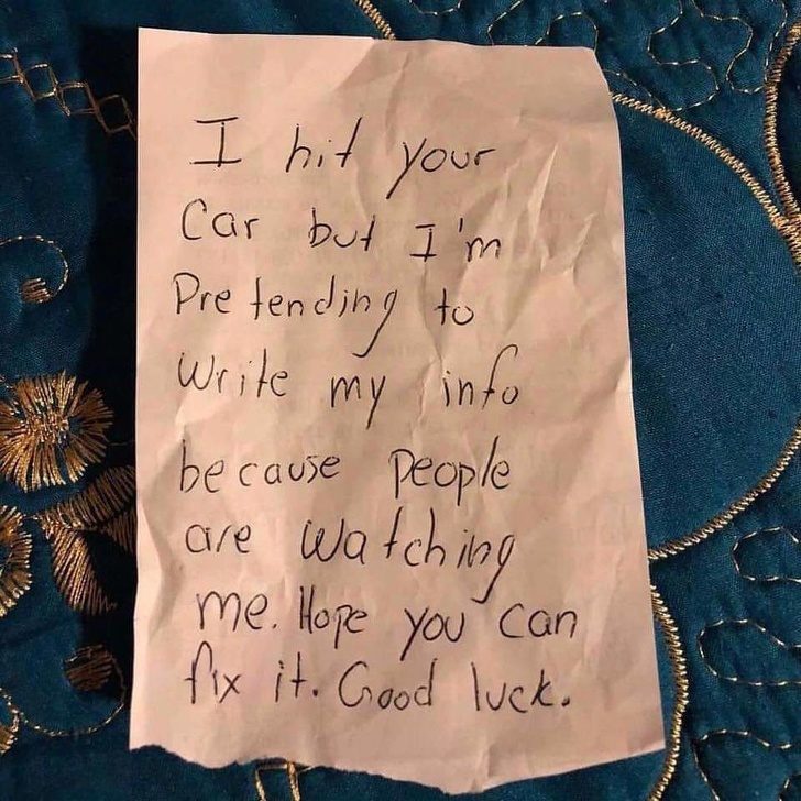 ▼「我撞了你的車子,有人正在看著我,所以我假裝寫下我的聯絡訊息。希望你修得好它,祝你好運。」