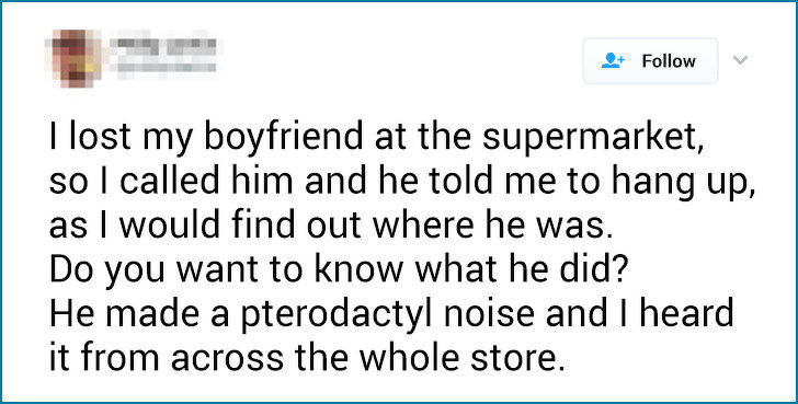 ▼「我和男友在超市走散了,我打給他,他叫我掛斷電話,還說我很快就能知道他在哪裡。接著他發出了恐龍一樣的吼叫聲,整個超市中的人都聽到了。」
