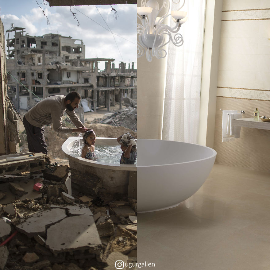 2018年11月27日每一分每一秒,世界上都在發生天差地別的事。有些地方歌舞昇平,有些地方戰火連天。當你與家人歡聚,抱怨著生活中的小事時,也許有人正帶著小孩躲避砲火,不知道能不能看到明天的太陽。土耳其PS大神Uğur將不同世界的畫面拼接起來,這強烈的反差讓人很震撼。