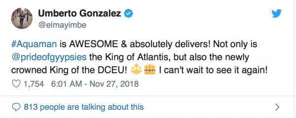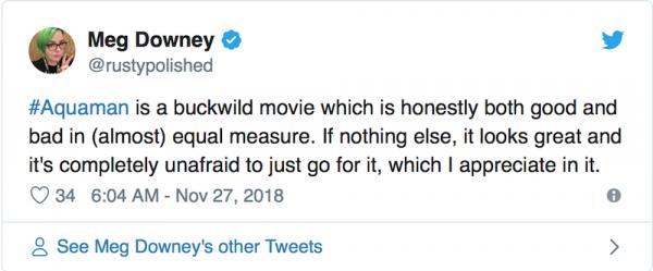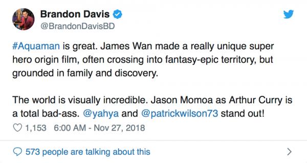 ▼「《水行俠》超棒!他證明了自己不只是亞特蘭提斯的國王,同時也是最新的DC宇宙國王!我等不及想再看了!」