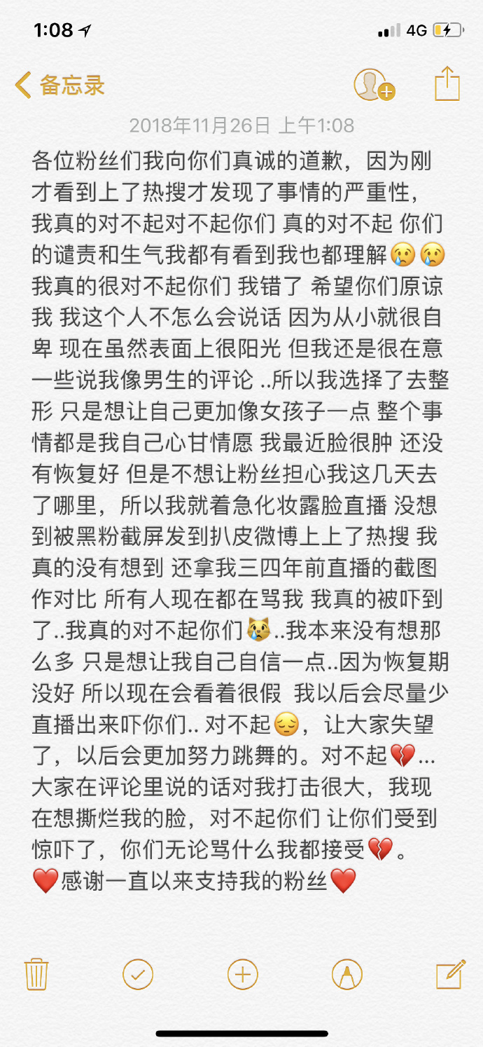 ▼隨著事件不斷發酵,Abbily在微博回應「因為從小就很自卑,現在雖然表面上很陽光,但我還是很在意一些說我像男生的評論,所以我選擇去整型」,也跟粉絲道歉,「大家在評論裡說的話對我打擊很大,我現在想撕爛我的臉,對不起你們,讓你們受到驚嚇了」,讓粉絲直呼心疼。