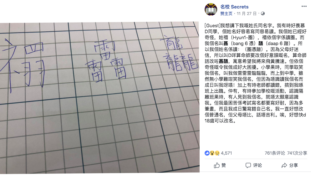 ▼這名網友表示,他很羨慕那些名字容易寫、容易讀的同學。他的姓比較少見,是「禤」(ㄒㄩㄢ),再加上名字「靐(ㄅㄧㄥˋ)龘(ㄊㄚˋ/ㄉㄚˊ)」,非常拗口。他無奈表示:「因為父母好迷信,所以叫算命師要改個好意頭的名,算命師說改了靐龘,寓意希望我將來飛黃騰達。」