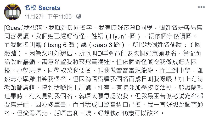 2018年11月29日相信大家在生活中都見到過一些奇怪的名字吧,香港一名網友在臉書粉絲團「名校Secrets」PO文,表示父母為他取的名字太奇怪,因此帶來了許多無奈和煩惱,網友一看他的名字都忍不住嘴角上揚。