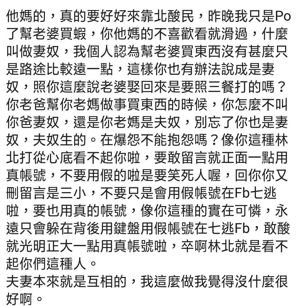 ▼原PO氣到直接用一篇320字的文章洗臉那些人,「你怎麼不叫你爸妻奴、還是你老媽是夫奴?別忘了你也是妻奴,夫奴生的。」