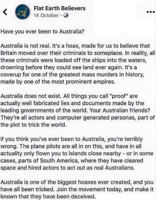 ▼「澳洲不存在」,並不是這200多位地平論者的想法,首先提出這一想法的,是一名叫做Shelley Folryd的18歲女孩。2017年時,她在社群網站上發表了一篇「學術論文」,聲稱「澳洲不存在」。這一觀點很快引起網友關注,被瘋狂分享。