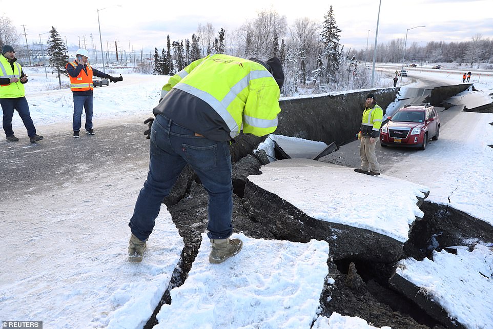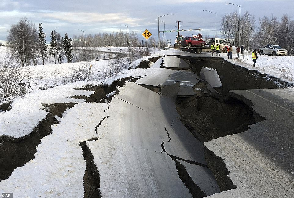 ▼阿拉斯加州的建築受損不嚴重,但在地震的強烈搖晃中,很多道路斷成好幾節,樹木倒塌、超市貨架上的商品散落一地。有些房屋的牆壁開裂,或者水管爆裂,但沒有發生災難性的建築物倒塌情況。