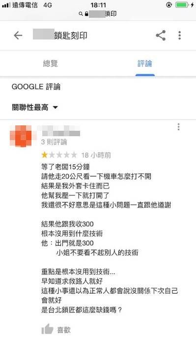2018年12月04日一名女網友因為機車坐墊打不開,請附近鎖行的老闆前來處理,最後發現只是外套卡住了,用力壓一下就好。她認為老闆收她300元不合理,事後在鎖行的Google評論留下一顆星,還怒批:「台北鎖匠都這麼缺錢嗎?」