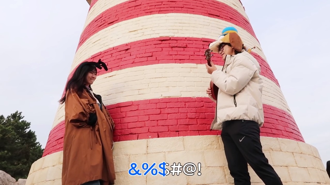 ▼似乎已經察覺男友意圖的阿福,還未聽到歌聲就已經癟嘴掉淚,激動的等著HowHow的演出。結果因為他實在太緊張,短短幾句歌詞中不斷走音、忘詞、Key太高上不去,樂園的遊客也不斷亂入鏡頭中,讓不久前還在哭的阿福也忍不住笑了!