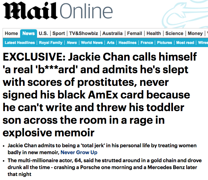▼有一名外媒資深記者Daniel Bates閱讀後,忍不住在《每日郵報》投書批評,直接以「成龍自稱混蛋且承認他和應召女睡過」當標題。