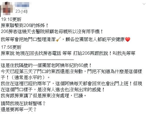 2018年12月05日多關心一下身邊的人,我們的社會將變得更溫暖。一名女網友在臉書社團「爆廢公社」po文說,她租屋對面的房客是一位60歲左右的獨居阿姨。阿姨每天都會出門上班,這幾天卻突然沒有動靜。她擔心阿姨發生了什麼事,連忙和房東聯絡請求協助。