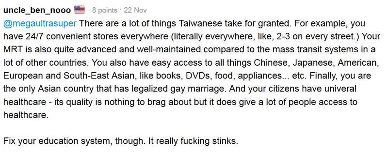 ▼還有一位對台灣似乎頗為了解的美國網友表示:「台灣人把很多事情視為理所當然,例如到處都有24小時營業的便利商店(我是指真的到處都是,每條街上都有2-3間);與許多國家相比,你們的捷運很先進也維護得很好,你們很容易就可以接觸到中國、日本、美國、歐洲或是東南亞的東西,像是書、DVD、食物、用品……等等,最後,你們是亞洲唯一一個同志婚姻合法化的國家,你們的國民有全民健保,或許品質無法保證,但是至少讓很多人可以有健康保險…不過你們的教育系統是該改善一下,爛透了。」