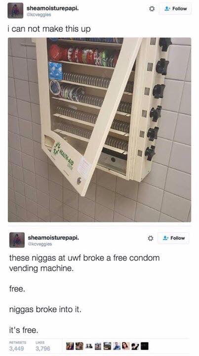 ▼最後有一位網友貼圖表示:「你們這些蠢蛋以為我們都是住在公民法治社會,這徹底搞錯了。」畫面裡,是一個被撬開的保險套機器,他指出:「但這本來就是免費取用的…」