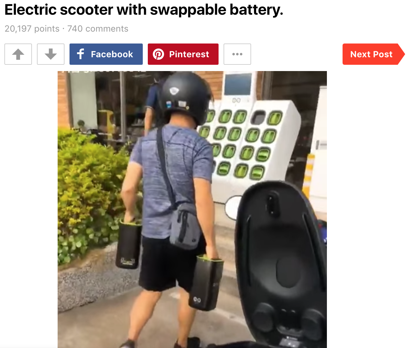▼9GAG日前就以「可交換電池的電動機車」為題,介紹了台灣的Gogoro,對於很多沒嘗試過電動機車的外國網友來說,這是一個很有趣的景象。