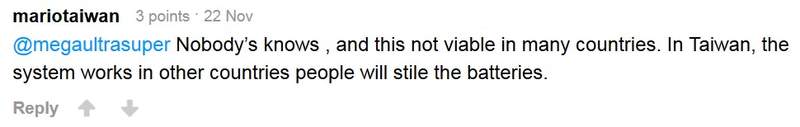 ▼「我們不知道有這東西,而且在很多國家這行不通,在台灣這可以,但在其他國家,人們會把電池偷走。」