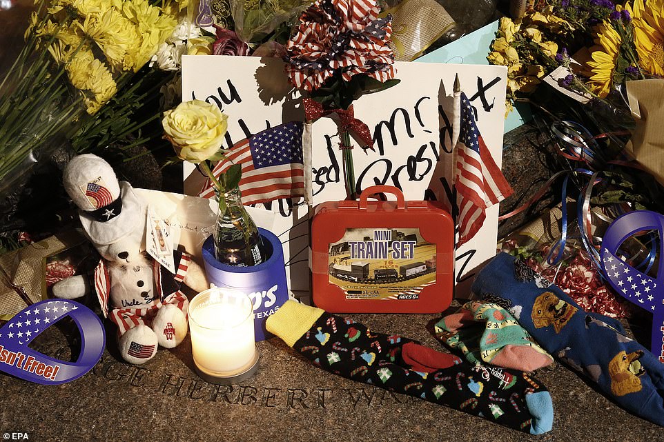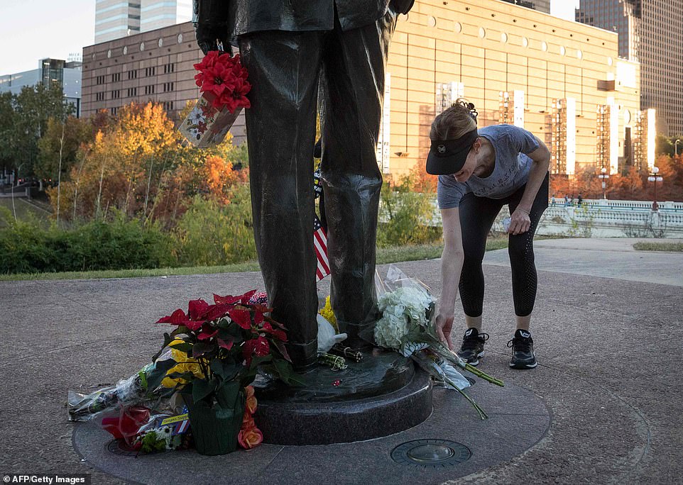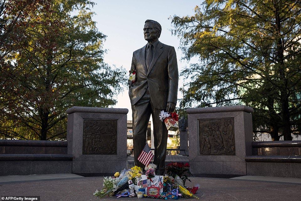 ▼美國民眾也紛紛在老布希的雕像旁,擺放了鮮花、蠟燭,以及各種留言和紀念小物,表達他們對老布希的敬重與思念。