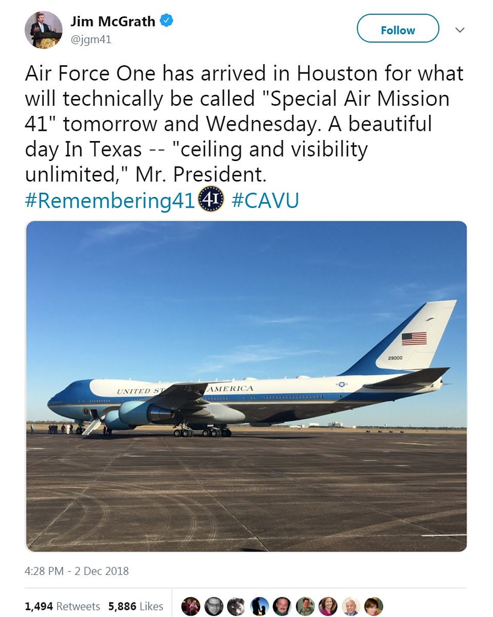 ▼布希家庭的對外發言人「吉姆‧麥克格雷斯」(Jim McGrath),也為此特別發表了一篇推特:「空軍一號為了直行特別的『41空中任務』(此數字為老布希的就任期),已經抵達了休士頓。今天的德州是如此的美麗。」