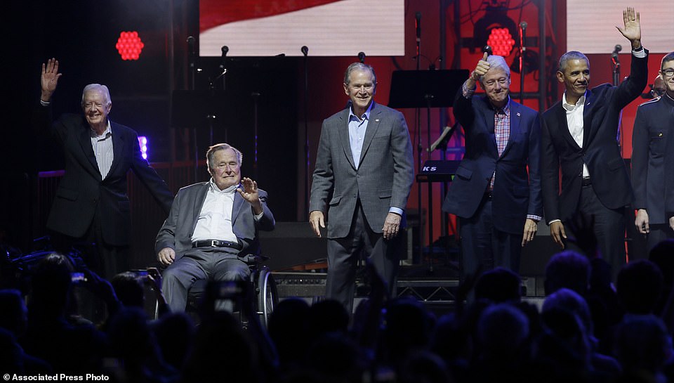 ▼回溯至西元2017年10月21日,這晚一共有五位前美國總統齊聚一堂,在嚴重的颶風災難過後,為所舉辦的悼念撫慰音樂會站台。從左至右分別是:吉米‧卡特(第39任,Jimmy Carter Jr.)、老布希、小布希、柯林頓、,巴拉克‧歐巴馬(第44任,Barack Obama)。