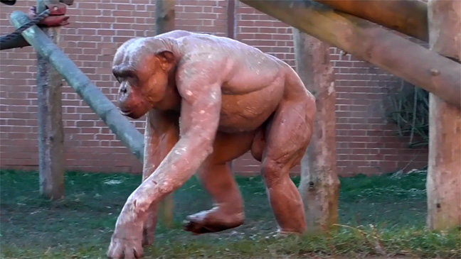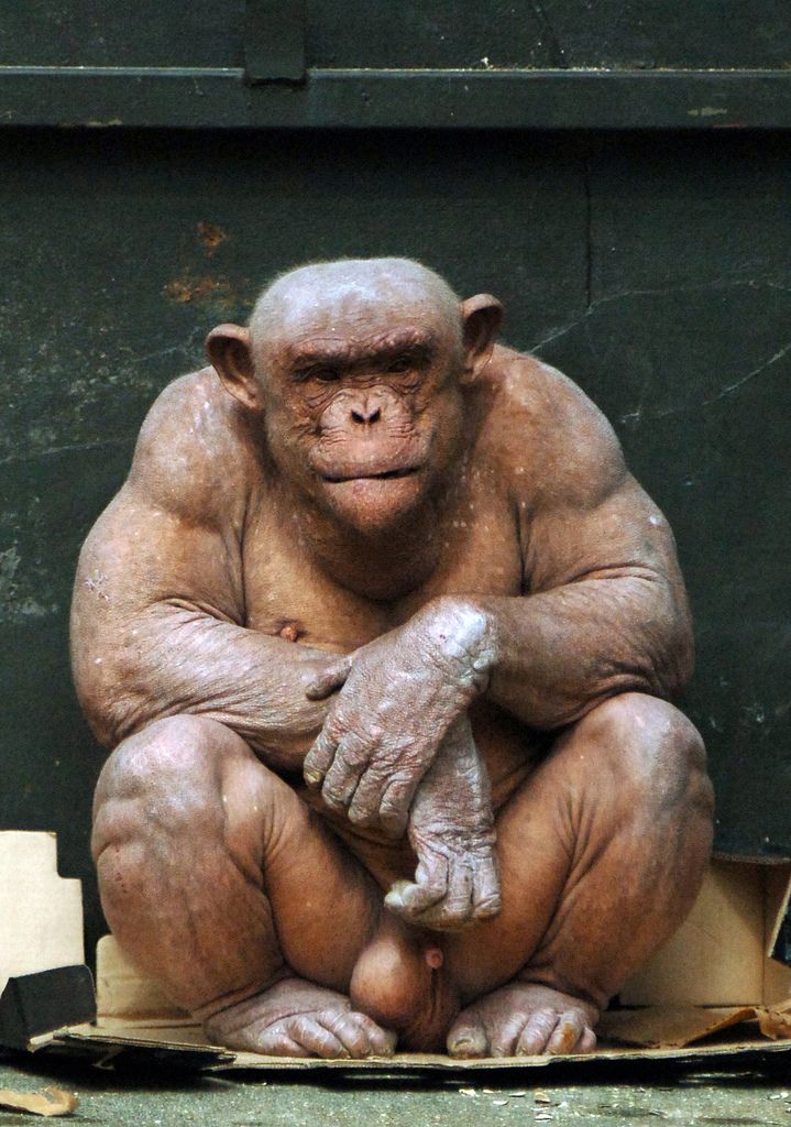 ▼位於英國阿瑟斯頓(Atherstone)的「Twycross動物園」,那裡不只有黑猩猩,還有全身光禿禿的脫毛大猩猩。有別於其他黑猩猩,在因為沒有毛髮覆蓋的情況下,大猩猩赤裸裸的體態與肌肉線條,更顯魁梧奇偉。瞧瞧那雙驚人的結實手臂,感覺就像是個強而有力的拳擊手。