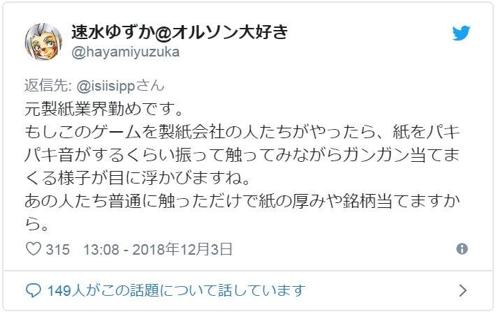 ▼對於紙產業的工作人員來說,「紙神經衰弱」就沒那麼難了:「以前在制紙業工作。如果這個遊戲讓制紙公司的人玩的話,他們應該光靠甩紙張跟觸摸就可以猜對。因為那些人簡單摸一下就能說出紙的厚度和名稱。」