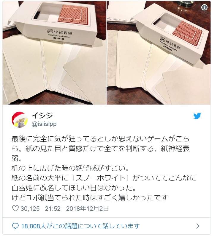 ▼怪不得網友崩潰說:「最後玩到完全發狂的遊戲就是這個。只能靠紙的外觀和質感去判斷的『紙神經衰弱』。攤在桌子上時完全絕望了…」