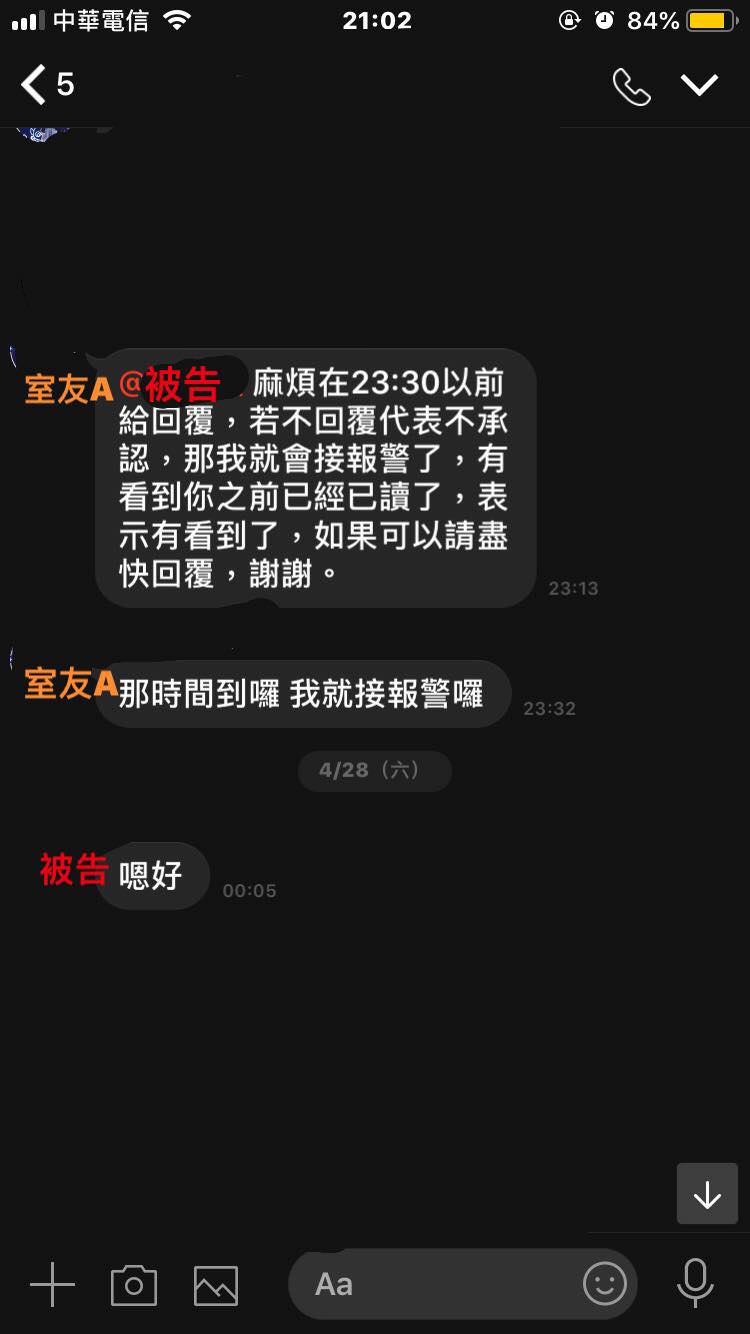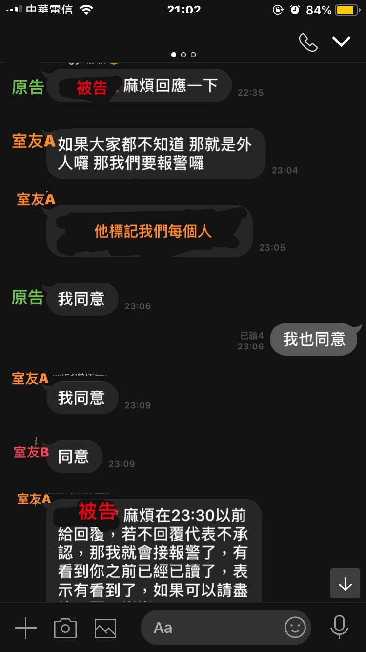 ▼原po也表示最誇張的是,事情發生的時間大約在四月底,被告到警局做筆錄時是五月中,DNA檢驗是六月底,一直到檢察官傳訊時已經是九月中了。到了檢察官傳訊時,被告才跟檢察官表示「她是不小心喝錯的,她真的想要跟原告誠心道歉並賠償!」以下就是她們當時在群組內的對話: