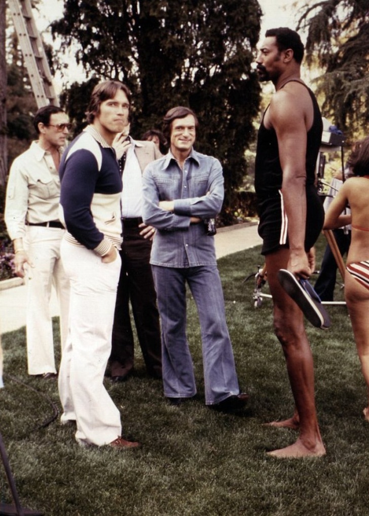 ▼阿諾史瓦辛格、威爾特張伯倫和休海夫納在1970年代一起出來玩的照片。
