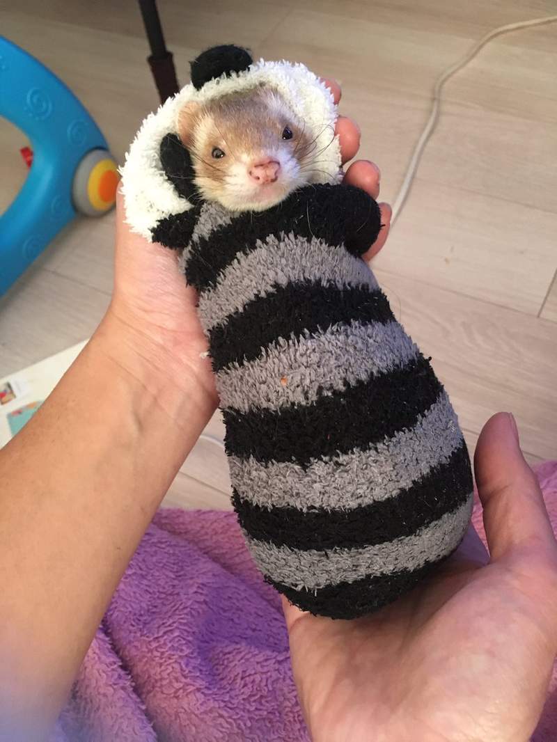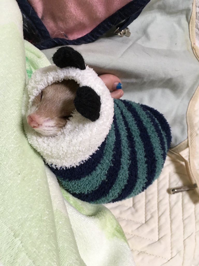 看牠甜睡的表情就知道牠有多喜歡這個睡袋了,這畫面也太療癒了,沒想到這個小雪貂和毛毛襪居然這麼搭,可愛到犯規了!