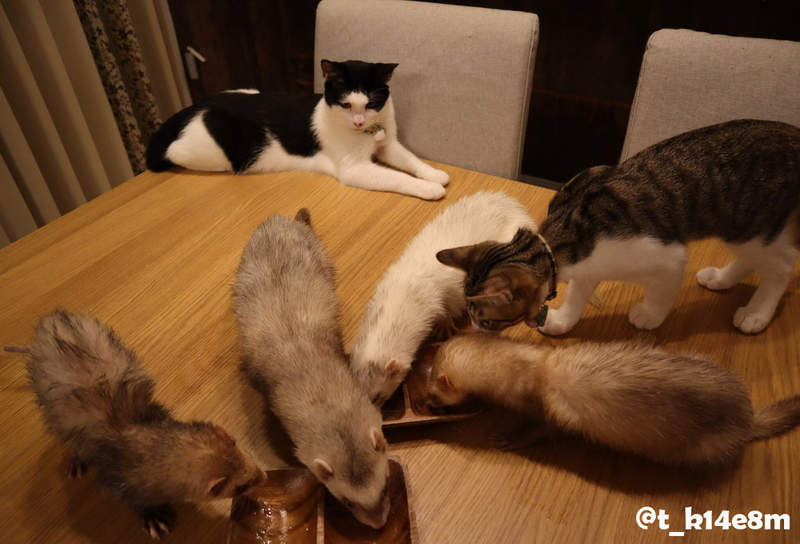 2018年12月11日日本網友@t_k14e8m和老公養了2隻貓咪和4隻雪貂,她經常在推特上分享寵物的可愛日常。每天都有笑不完的趣事發生,一家人的生活過得非常開心。看了他們分享的日常,大家也被感染到一整天都覺得愉悅。