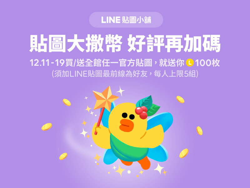 購買或贈送全館任一組官方貼圖,即可獲得LINE代幣100枚,每個帳號回饋上限為500代幣。