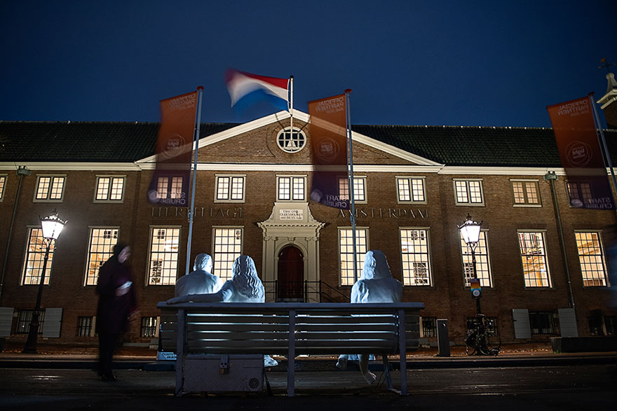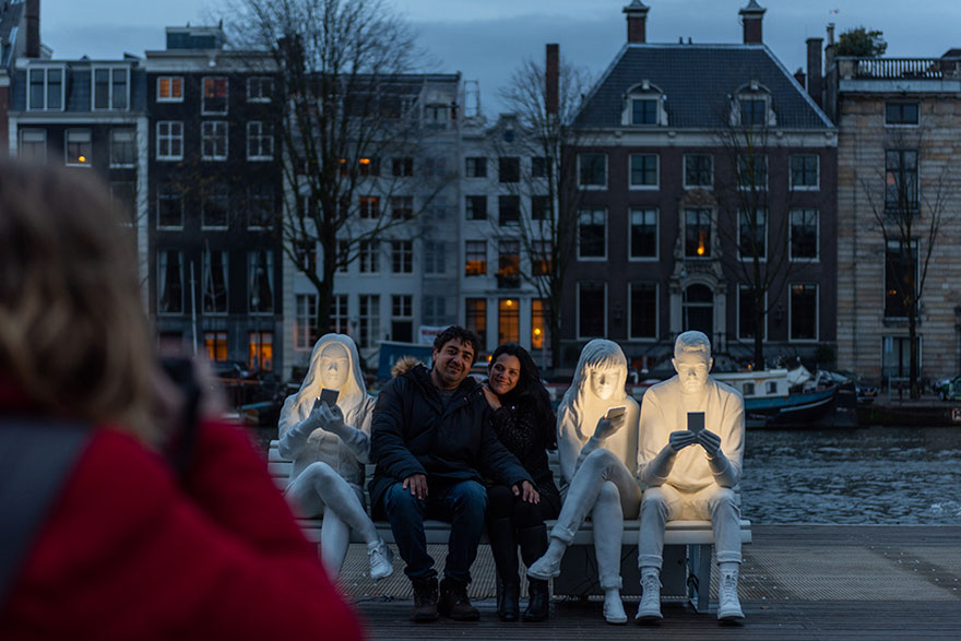 ▼英國藝術家Gali May Lucas和德國雕塑家Karoline Hinz合作,創作了一系列名為「ABSORBED BY LIGHT」的雕塑。這些雕像坐在長椅上捧著手機,螢幕發出的光照亮了他們的臉。