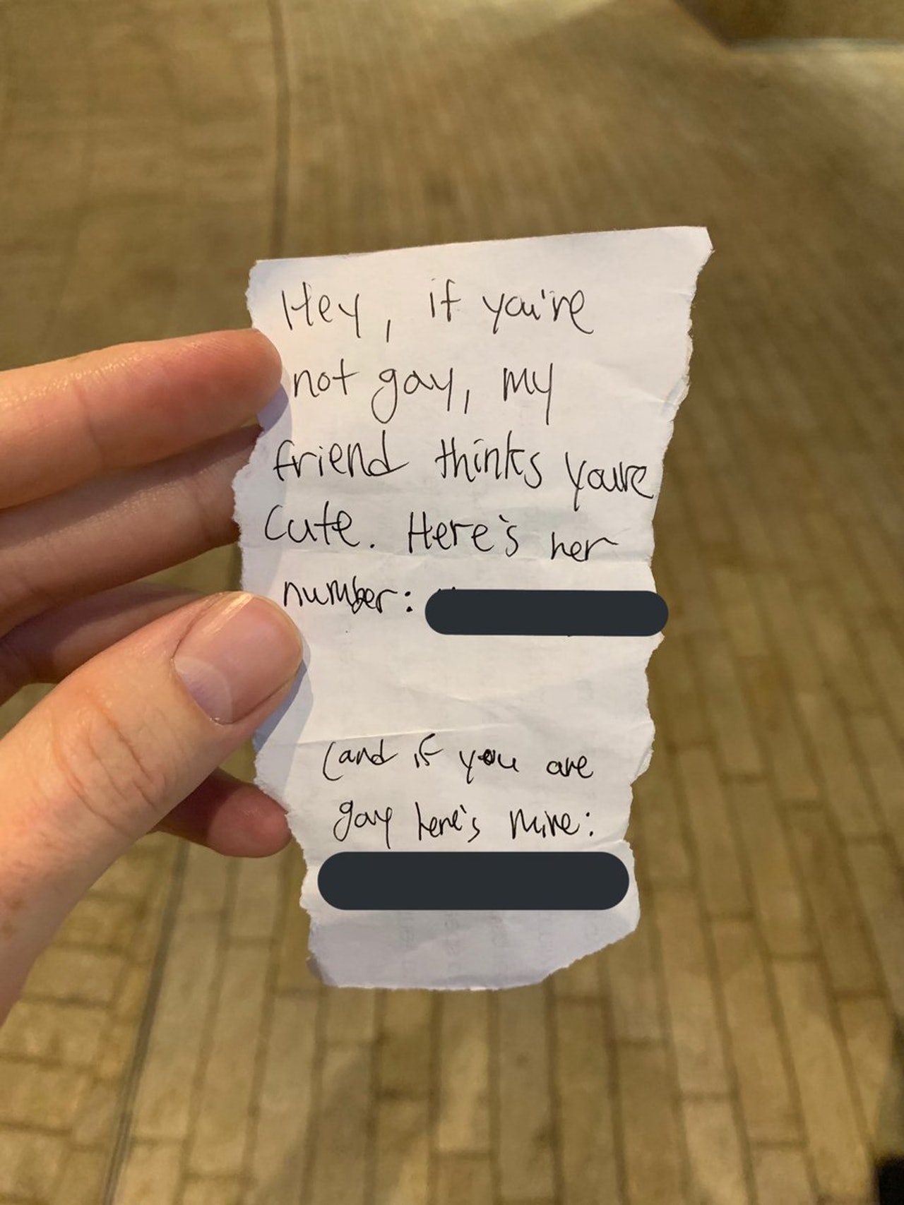 ▼那張紙條上寫著:「嗨!如果你不是同性戀,我的朋友覺得你很可愛,這是她的電話號碼……如果你是同性戀,這是我的號碼……」