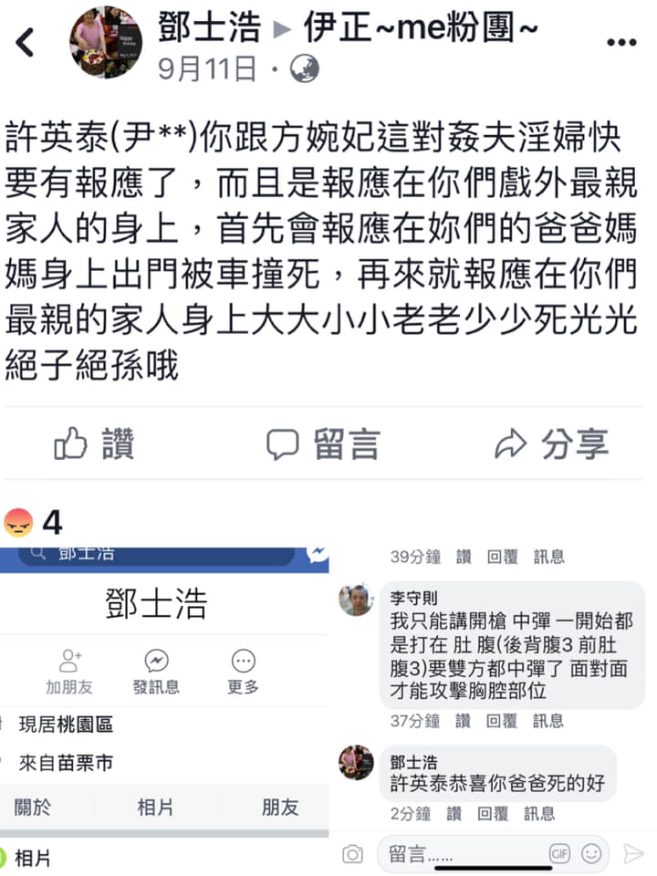 ▼伊正表示有網友從9月開始就在粉絲專頁留言:「你跟方婉妃快要有報應了,而且是報應在你們戲外最親家人的身上。」沒想到對方連父親舉辦公祭也還在亂罵,讓他無法繼續容忍。