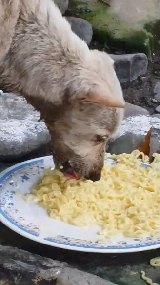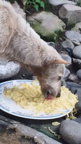 ▼從網友所分享的影片可以看到,因為看到這隻流浪狗太過於飢餓了,在街上又找不到食物,於是端了一碗吃剩的麵給牠充飢。