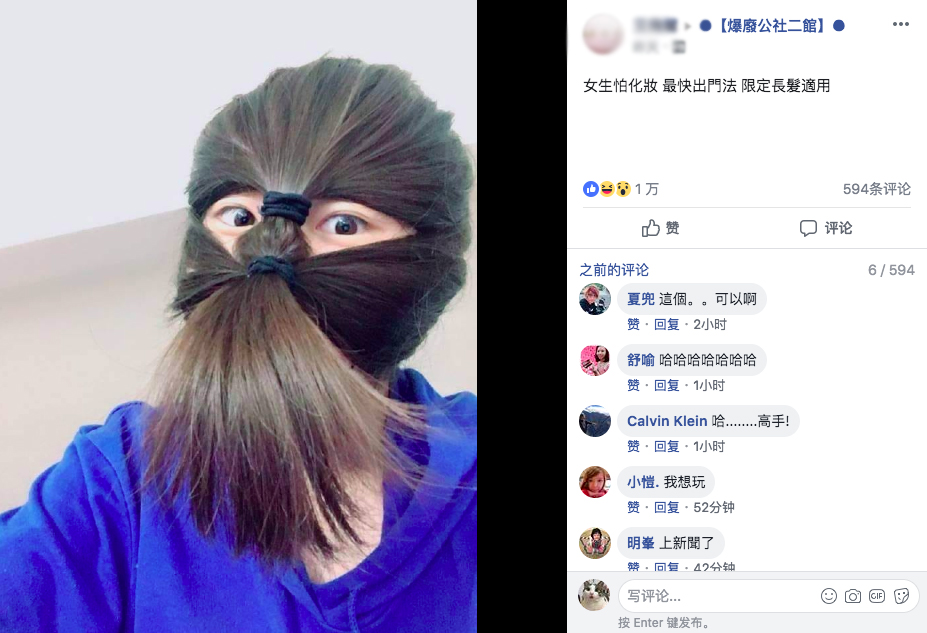 ▼一名網友將這張照片po到臉書「爆廢公社二館」,驚訝說:「女生怕化妝,最快出門法,限定長髮適用。」
