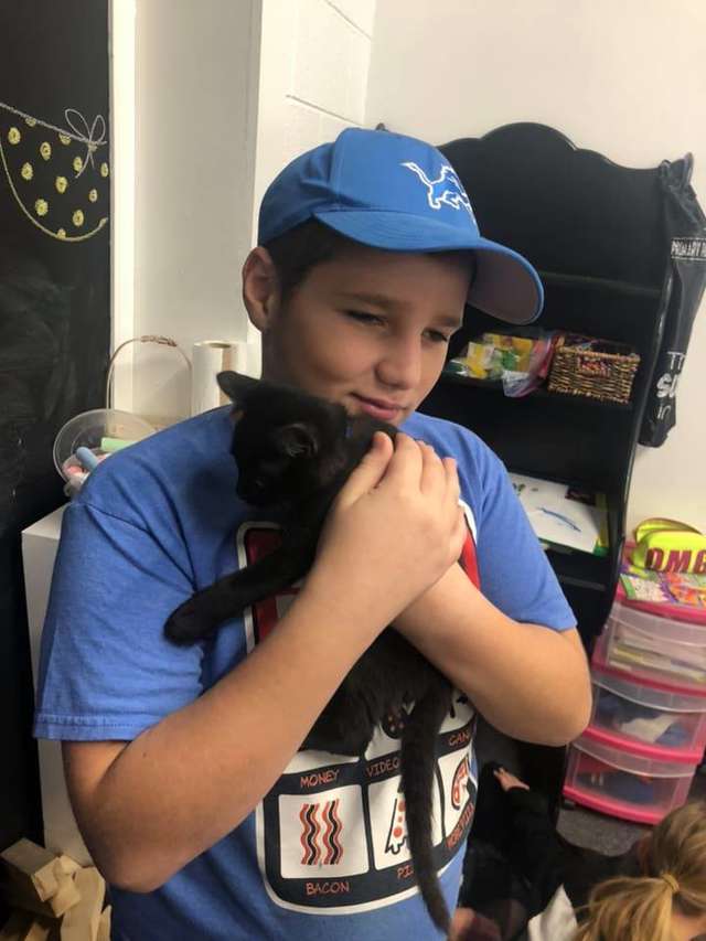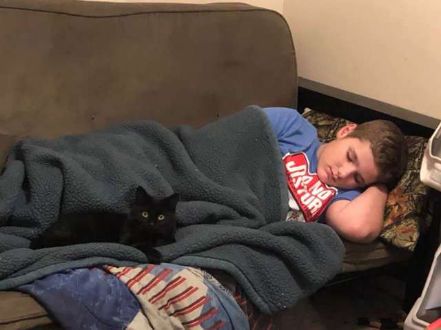 ▼不久前,Austin和媽媽一起參加了一個貓咪領養活動,其中一隻叫Gizzard的小黑貓與Austin一見如故。牠還爬到Austin的腿上,放鬆地躺下來休息。媽媽發現Austin很喜歡這隻貓咪,決定給他一個驚喜。