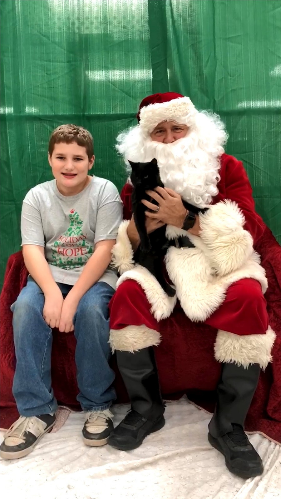 ▼媽媽悄悄為這隻貓咪辦理了領養手續,但沒有告訴Austin。12月1,HSGC舉辦了另一場領養活動,並請來聖誕老人與大家合照。媽媽讓Austin與聖誕老人合照,拍了幾張照片後,聖誕老人突然說:「今晚小貓咪便可以與你一起回家。」說著還把Gizzard遞到了他手中。