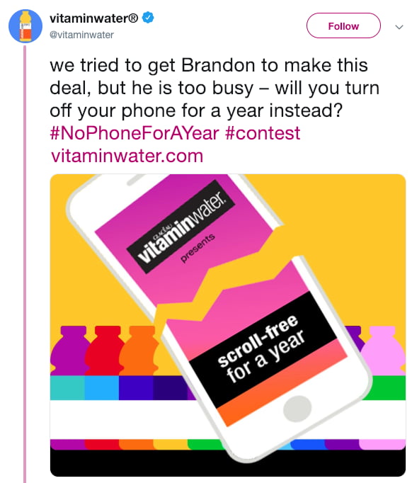 ▼如果你對自己有信心,想參加挑戰,可以在推特或IG上發布一則貼文,標記酷樂仕維他命(@vitaminwater),並打上主題標籤#nophoneforayear及#contest。貼文內容是不使用智慧型手機的這一年會做什麼。這一活動的報名截止日期為2019年1月7日,現在還有機會喔。