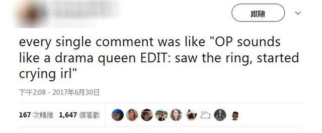 ▼看到這裡,網友們都很好奇,究竟是什麼樣款式的戒指,令她受到如此打擊,幾近崩潰?XD